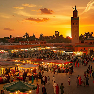 Giornata dedicata alla scoperta di Marrakech. I Giardini Majorelle offrono una pausa di colori e tranquillità, mentre il Palazzo Bahia vi farà immergere nell’arte e nell’architettura moresca. Passeggiando nella medina, respirerete i profumi di spezie e dolci locali e potrete scoprire l’artigianato marocchino più autentico. La sera, la piazza Jemaa el-Fnaa prende vita con musicisti, artisti e bancarelle di street food, regalando un’esperienza immersiva e vibrante.